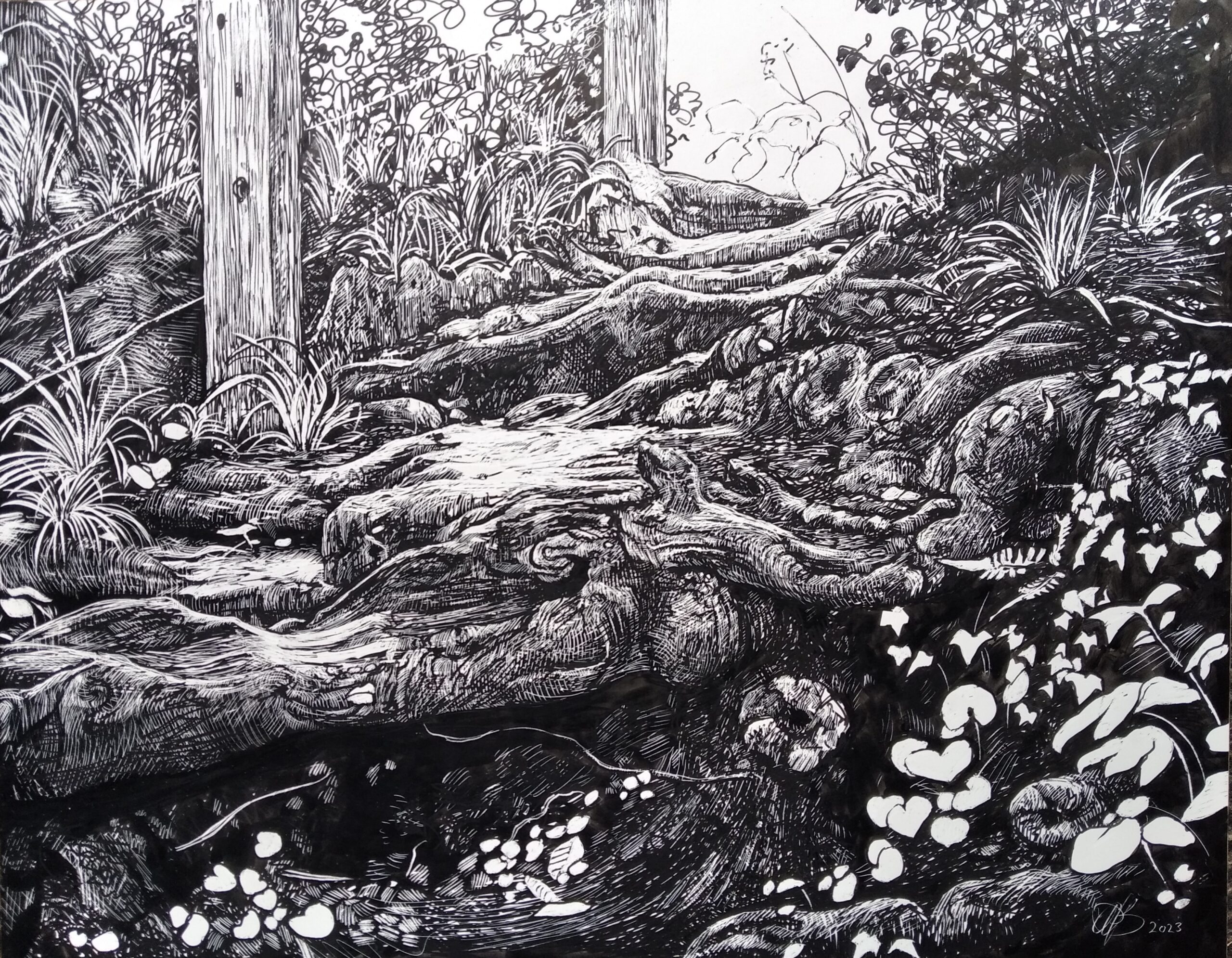 A natural staircase leading up from a sunken footpath. Drawn from my own photograph during Open Studios, May 2023.