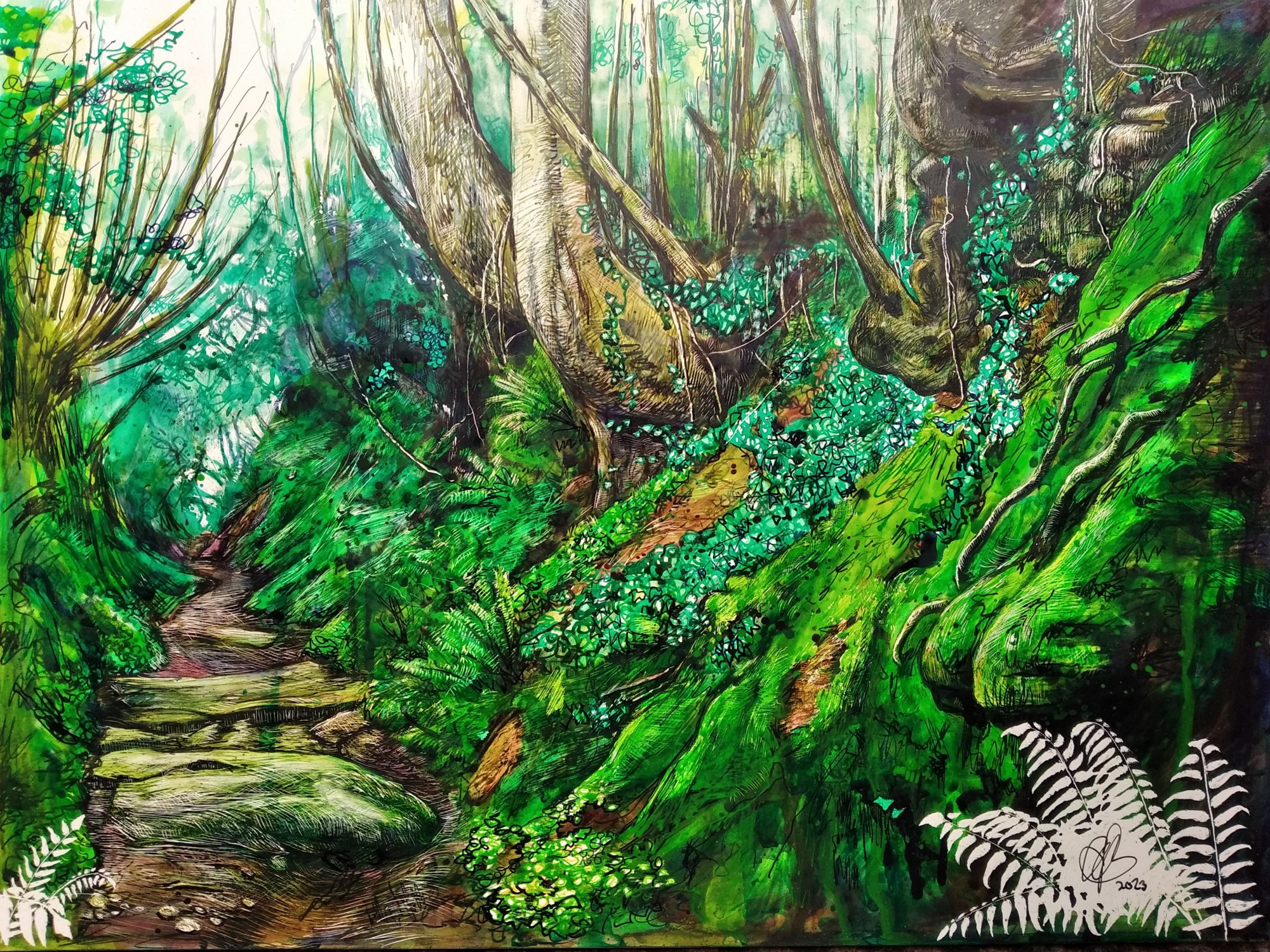 At the Petworth end, Hungers Lane is relatively tame, with lowish, sloping banks and relatively little rock visible. But by the time it comes back out onto the road network (at Rotherbridge Lane, a minor road), it has developed sheer cliffs on either side, almost cave- or tunnel-like with a roof of inclined tree trunks. It’s pretty dark in there andy not a little damp. This drawing shows the area just before the sides draw in to their steepest and narrowest, looking back towards Petworth. It’s quite moist even here, and the rocks were bright green with moss in May, when I visited.
