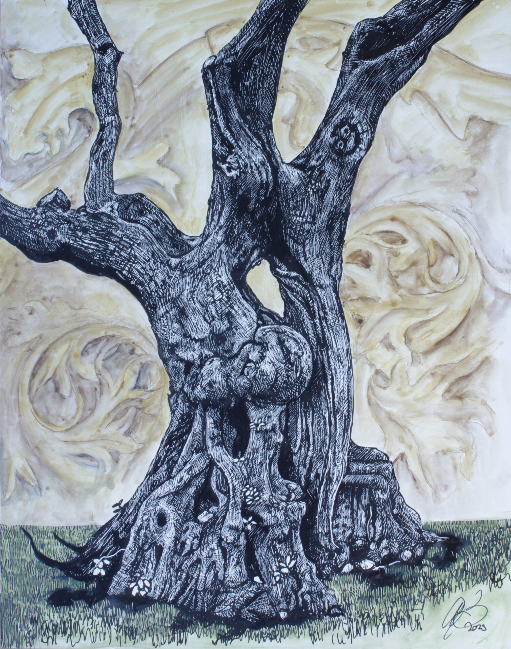 The Olive Tree, 14 x 11″, ink and Inktense on kaolin-coated board, £350